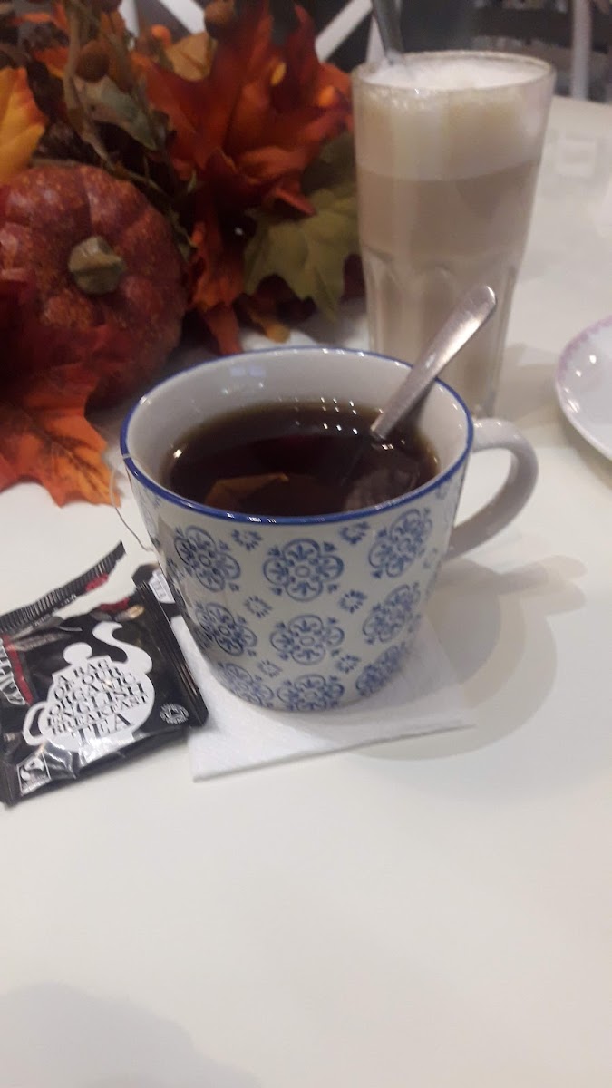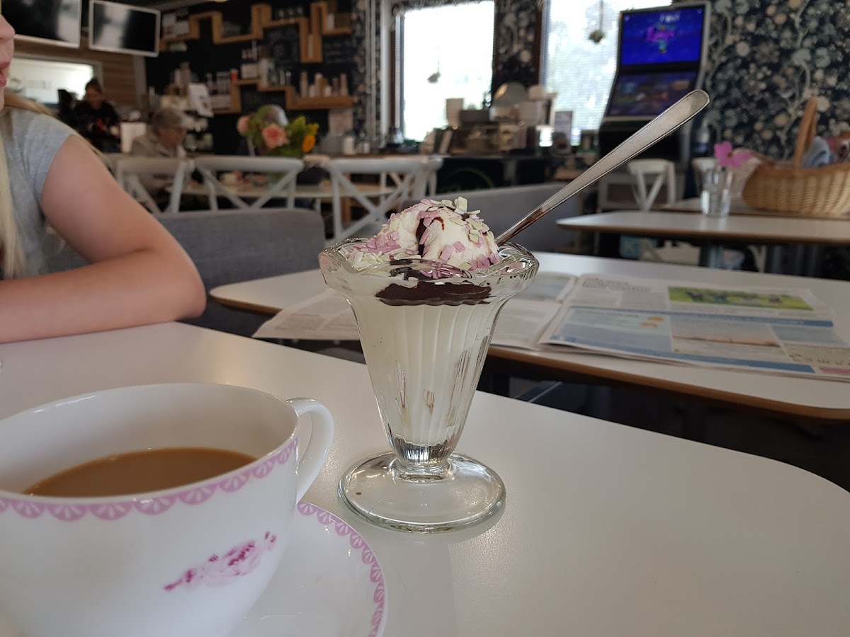 The espresso (€3.20) we had was more like a lungo, but the coffee tasted fine. Especially considering Finnish standards of espresso, I would say it was quite good. So, be warned, it is not italian coffee level of quality and expertise, but it likely is the best coffee you can find around this area. The cake we ate was just amazing. Home-made, quality ingredients (no artificial cream). The staff was super friendly and spoke English very well. Interior was cozy, and well lit. Tableware was not damaged in any way. You can buy used or damaged tableware from them for OK prices. Good thing they don't just throw them out, but give them a second life!